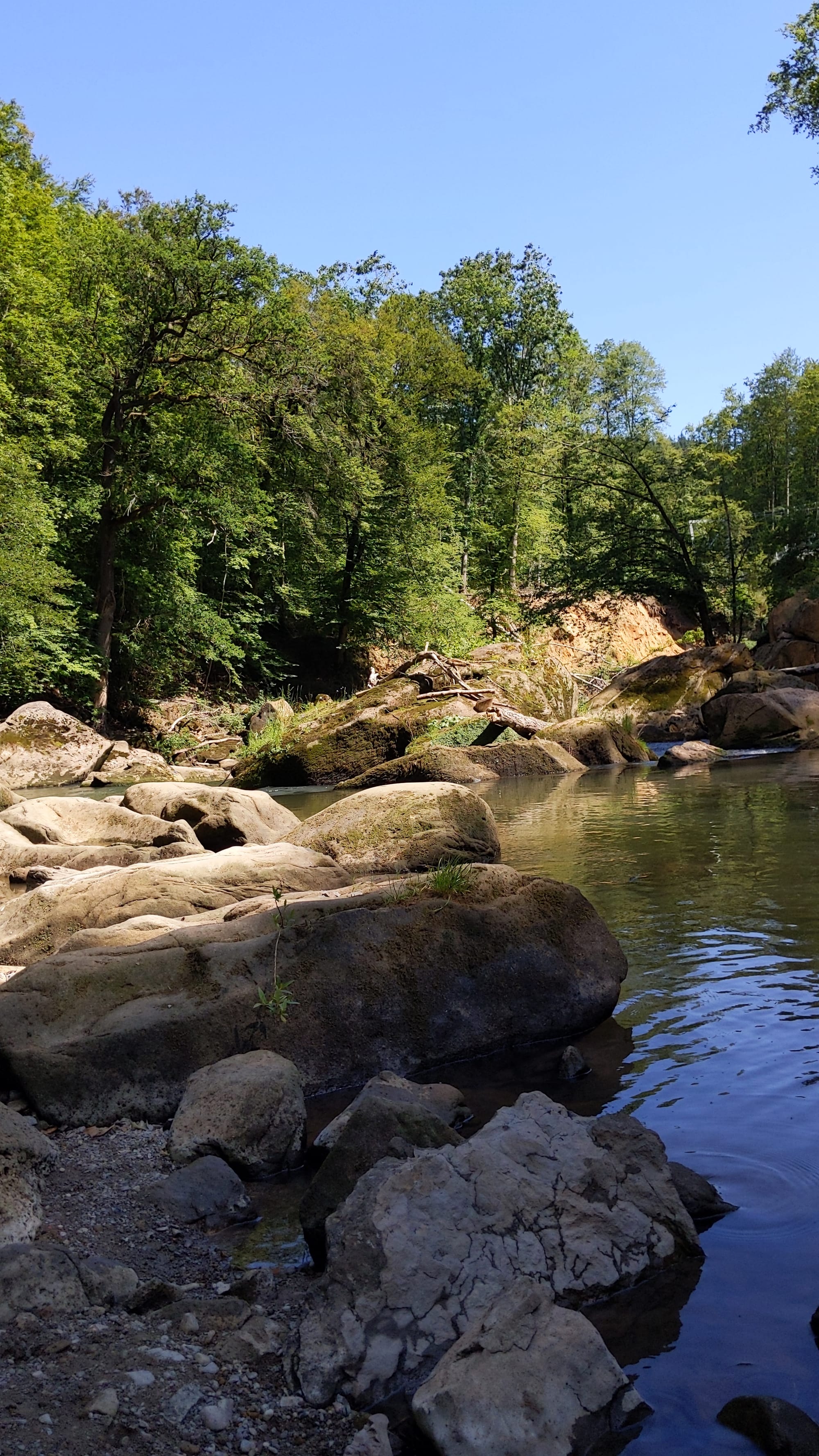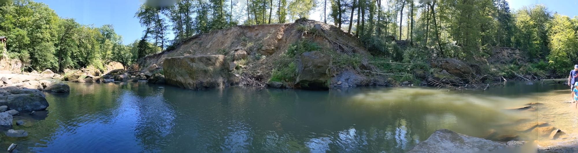 Baden ist zwar möglich, würde ich allerdings nicht empfehlen, da auf dem Grund viele spitze Steine liegen und auch die großen sehr rutschig sein können. Beine reinhalten ist da schon deutlich angenehmer.
