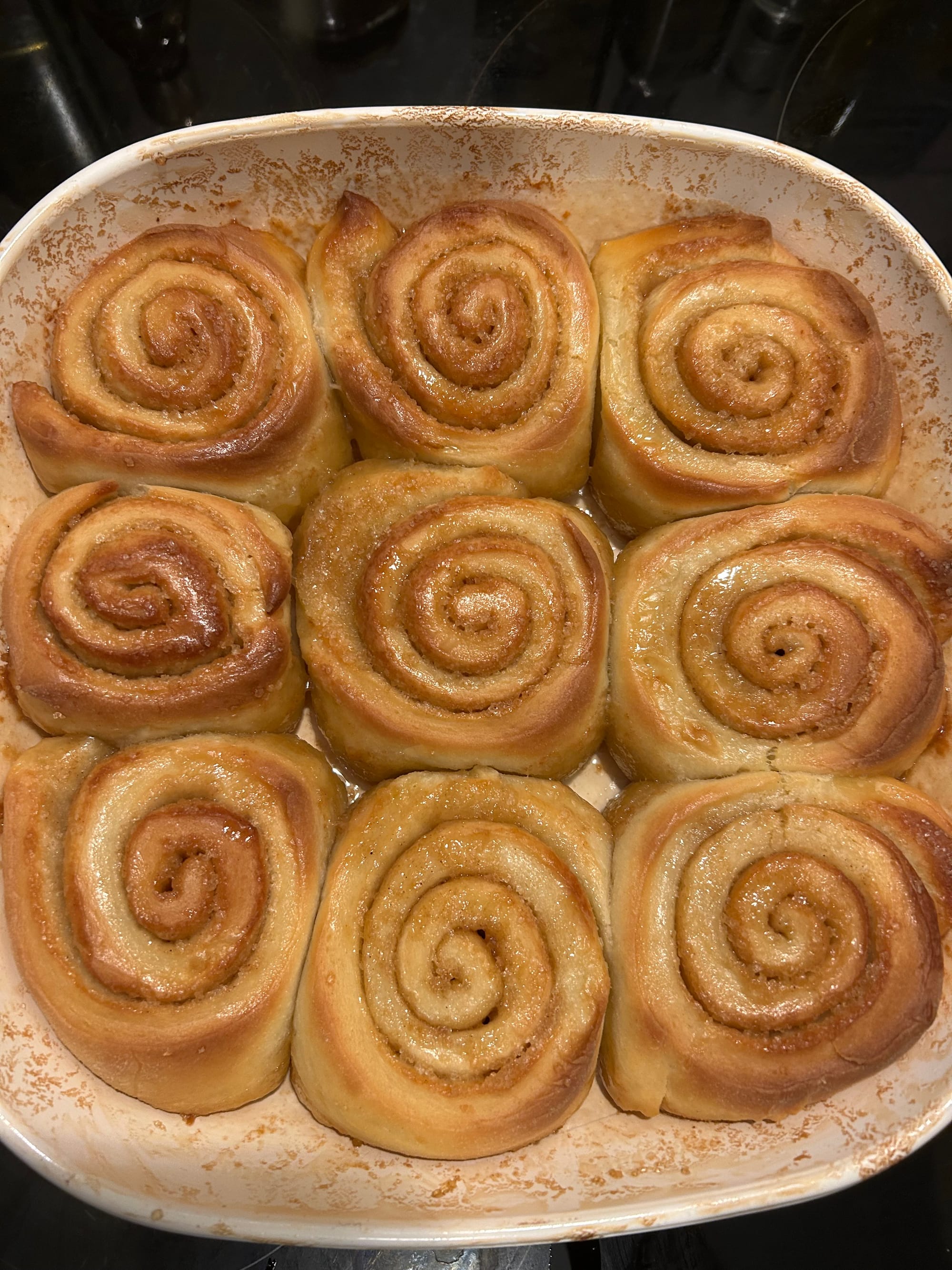 WICHTIG: Nach 15 Min. Backzeit die Zimtschnecken mit der Sahne übergießen und zu Ende backen lassen.